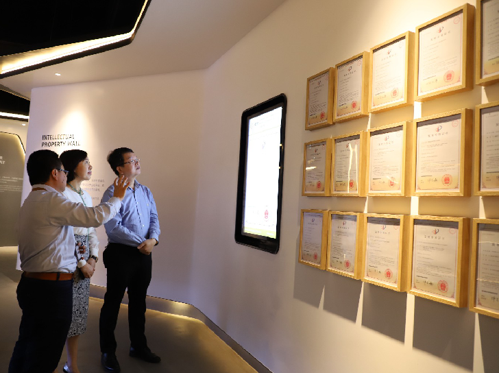 聽取了乾照光電知識產權工作情況介紹后,盧局長對乾照光電成立知識產權戰略部的做法表示贊賞,并祝賀乾照光電獲得國家級知識產權示范企業榮譽。盧局長在知識產權榮譽墻前駐足許久,勉勵乾照光電要加強技術創新,打造企業專利、商標、著作權的知識產權綜合實力。
