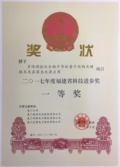 八、10月31日,福建省人民政府發(fā)文公布《2017年度福建省科學技術獎勵和專利獎勵的決定》。乾照光電與廈門大學、廈門華聯(lián)電子股份有限公司、廈門光莆電子股份有限公司聯(lián)合申報的“多場調(diào)控化合物半導體量子結構關鍵技術及其固態(tài)光源應用”從454項科技進步獎項目中脫穎而出,榮獲福建省科技進步獎一等獎。