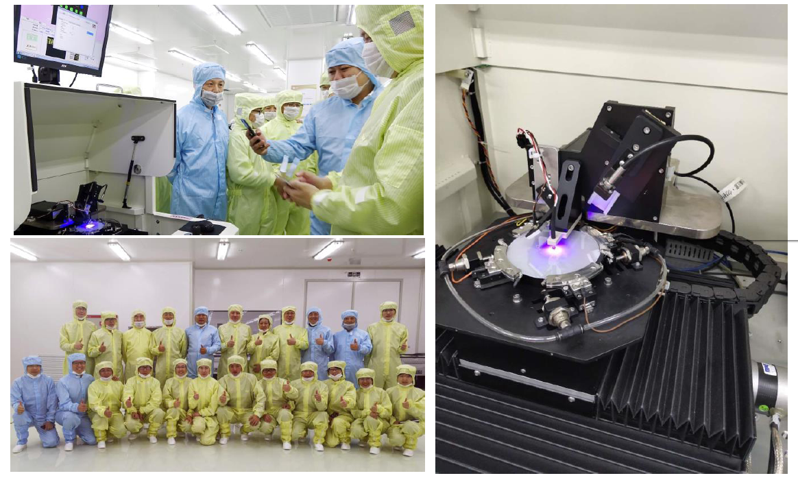 隨后,董事會(huì)一行參觀了外延MOCVD車間、質(zhì)檢間、芯片蒸鍍車間、清洗車間、黃光站、全測站,并觀看了芯片的生產(chǎn)過程,邱圣杰全程進(jìn)行了講解。在芯片點(diǎn)測間,董事會(huì)一行觀看了芯片的點(diǎn)亮過程,一枚4英寸晶圓在工程師的操作下被成功點(diǎn)亮,發(fā)出幽藍(lán)的光芒。經(jīng)過近4個(gè)月的設(shè)備調(diào)試,江西乾照光電的芯片性能得到了極大提升,標(biāo)志著江西乾照光電的生產(chǎn)研發(fā)取得了階段性的進(jìn)展。
