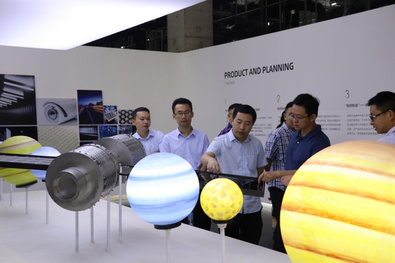 考察組一行來到公司展廳,工作人員介紹了公司的企業文化、項目的建設規劃布局以及LED芯片的應用領域。劉兆就公司的產品特點,特別是自主研發的三大高新技術產品做了專業的講解。朱局長針對公司在航空航天領域應用的砷化鎵太陽能電池產品的技術應用進行了探討與交流。