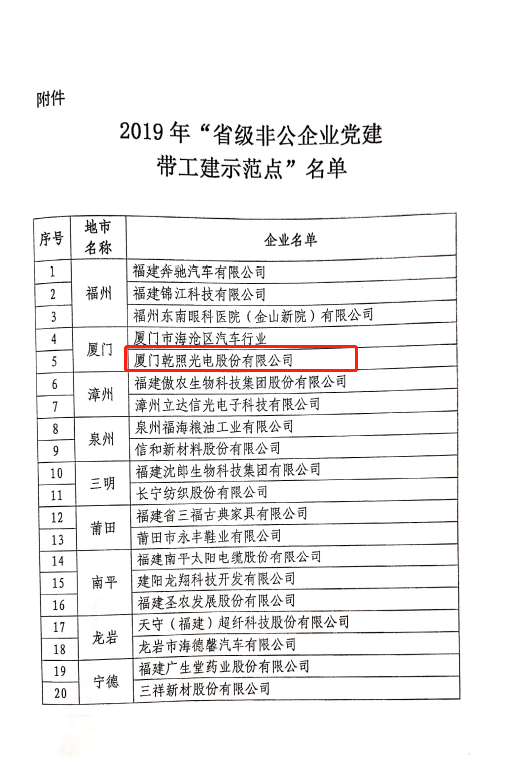 近日,為深入學(xué)習(xí)貫徹習(xí)近平新時(shí)代中國(guó)特色社會(huì)主義思想,認(rèn)真學(xué)習(xí)貫徹習(xí)近平總書記關(guān)于工人階級(jí)和工會(huì)工作的重要論述,深化黨建帶工建工作機(jī)制,福建省總工會(huì)研究決定,命名省內(nèi)20家單位為2019年“省級(jí)非公企業(yè)黨建帶工建示范點(diǎn)”,廈門乾照光電股份有限公司榮獲此稱號(hào)。