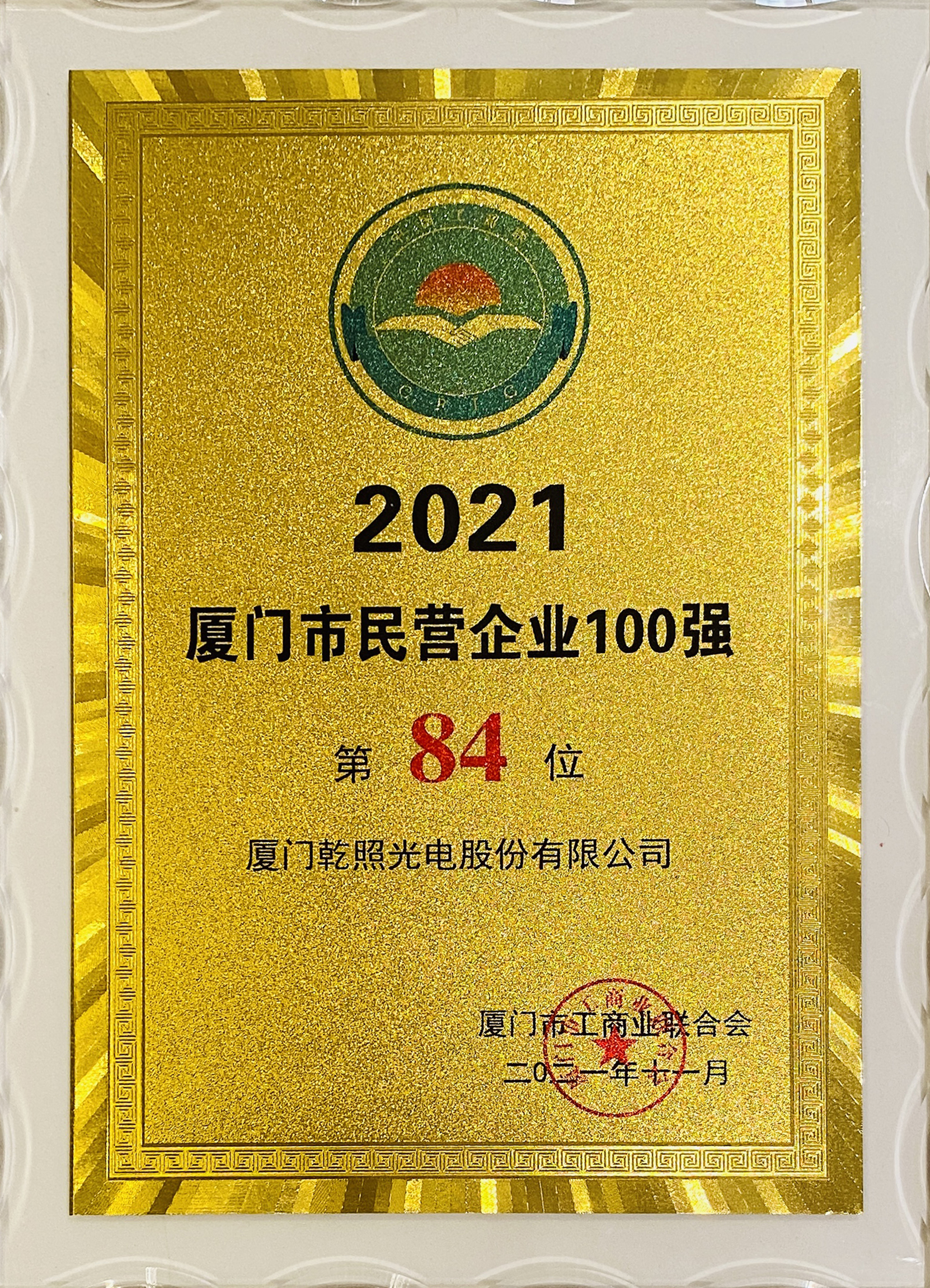 11月1日,廈門市工商聯(總商會)召開廈門市民營企業百強發布會。本次廈門市民營企業百強評選共有239家企業參評,涵蓋面廣代表性強。廈門乾照光電股份有限公司榮獲“2021廈門市民營企業100強”,成功入榜“2021廈門市民營企業科技創新20強”。