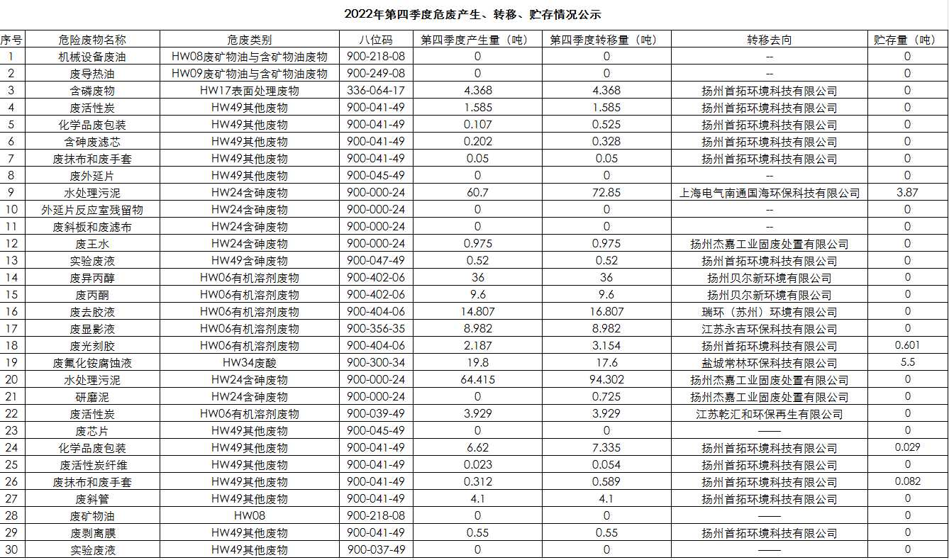 揚州乾照光電2022年第四季度危廢產生、轉移、貯存情況公示