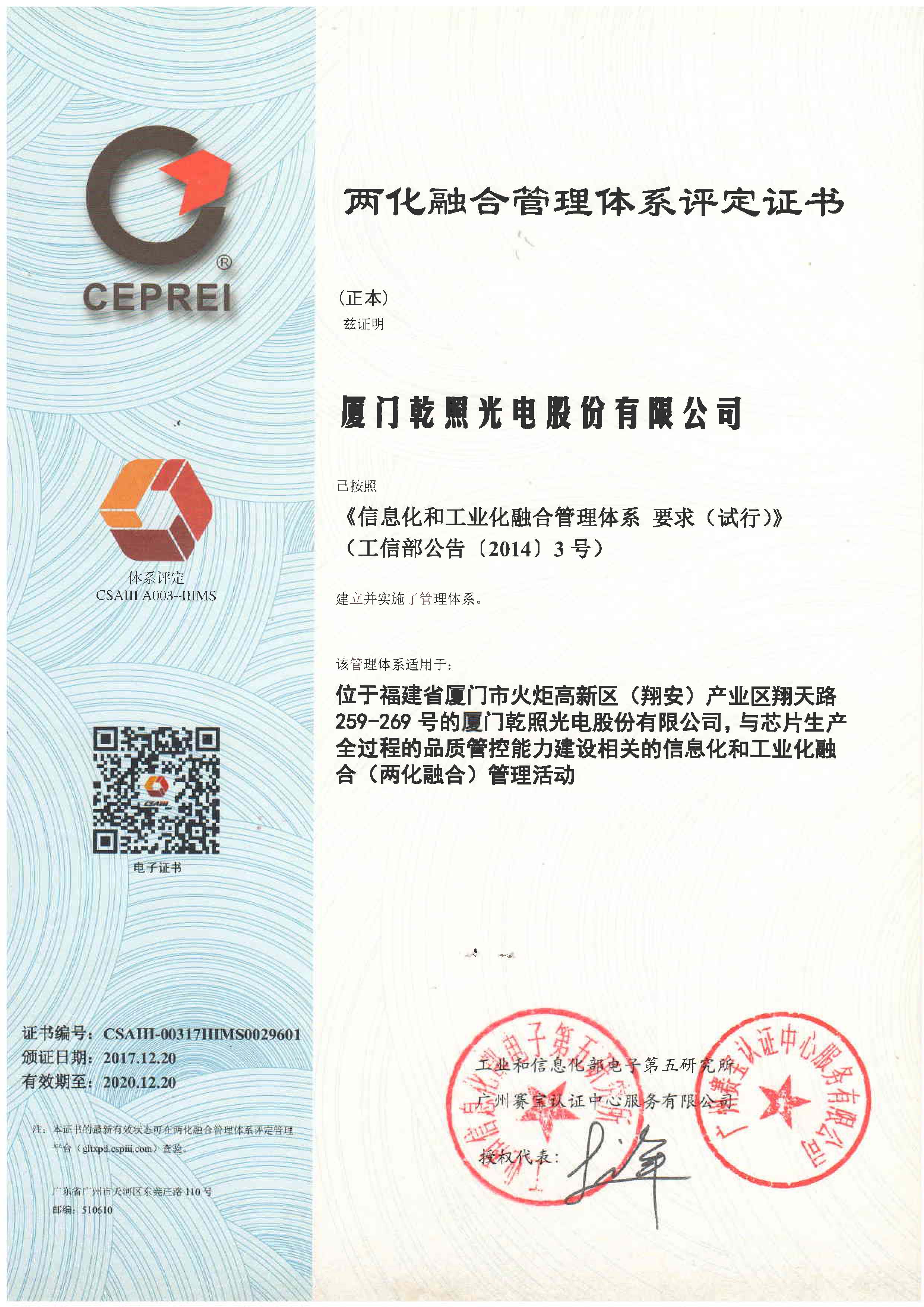 2017年12月20日,廈門乾照光電股份有限公司獲得兩化融合管理體系評定證書。這標志著乾照光電已建立起兩化融合管理體系,并在推進信息化和工業化深度融合方面取得顯著成效,在公司戰略轉型、組織變革、管理創新、技術融合和...