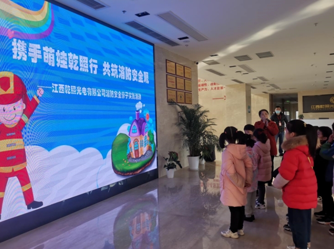 本次活動(dòng)共吸引了近30個(gè)家庭參與,孩子們來到父母工作的地方——江西乾照光電有限公司進(jìn)行參觀,在公司展廳了解了公司的基本情況及產(chǎn)品展示,在“幸福家庭大講堂”認(rèn)真觀看了消防安全宣傳教育視頻并參與了互動(dòng)問答。